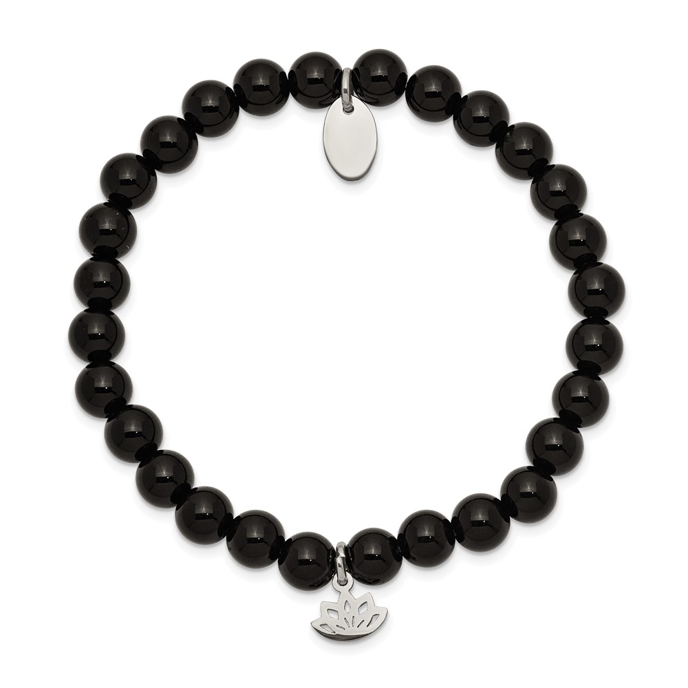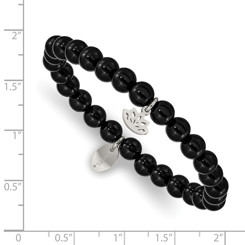 Chisel Stainless Steel Polished Lotus 6mm Black Agate Beaded Stretch Bracelet