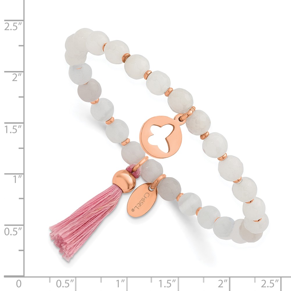 Chisel Stainless Steel Polished Rose IP-plated Butterfly 6mm Pink Agate Beaded Stretch Bracelet with Tassel