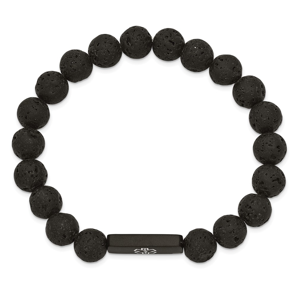 Chisel Stainless Steel Brushed Black IP-plated with White Enamel Medical ID 8.5mm Lava Stone Beaded Stretch Bracelet