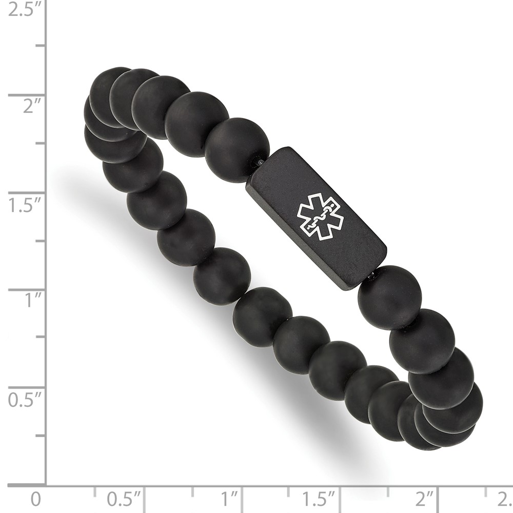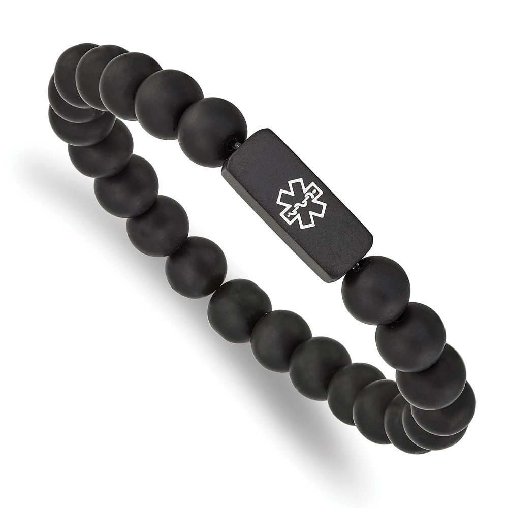 Chisel Stainless Steel Brushed Black IP-plated with White Enamel Medical ID 8.5mm Black Agate Beaded Stretch Bracelet
