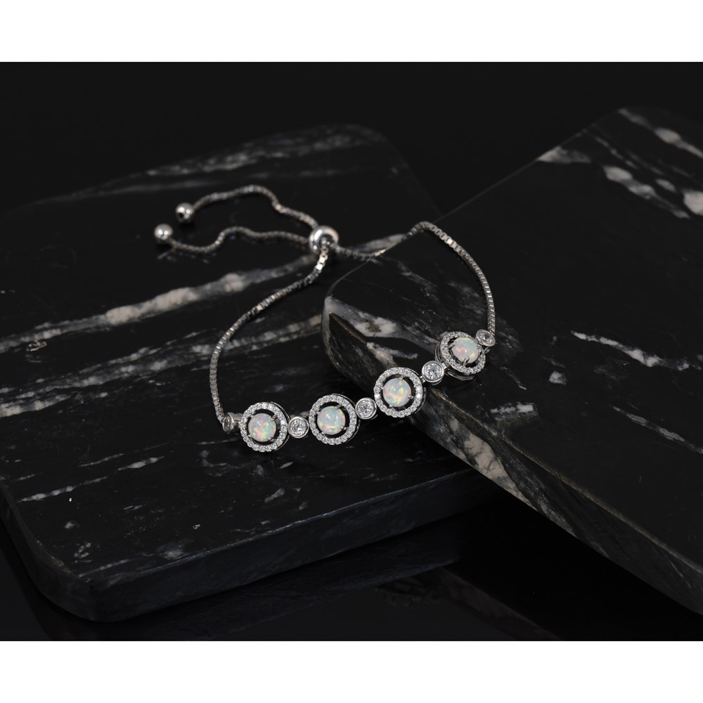 Sterling Silver RH-plated Created Opal and CZ Adjustable Bracelet