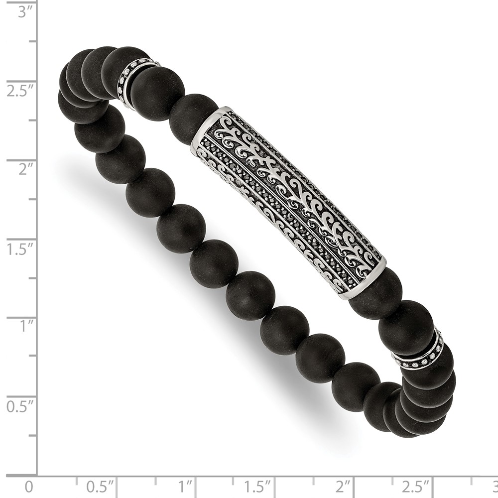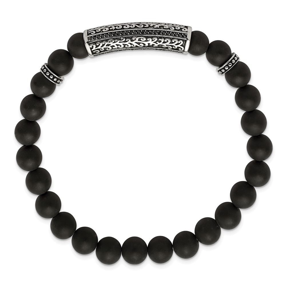 Chisel Stainless Steel Antiqued and Polished with Black CZ 8.5mm Agate Beaded Stretch Bracelet