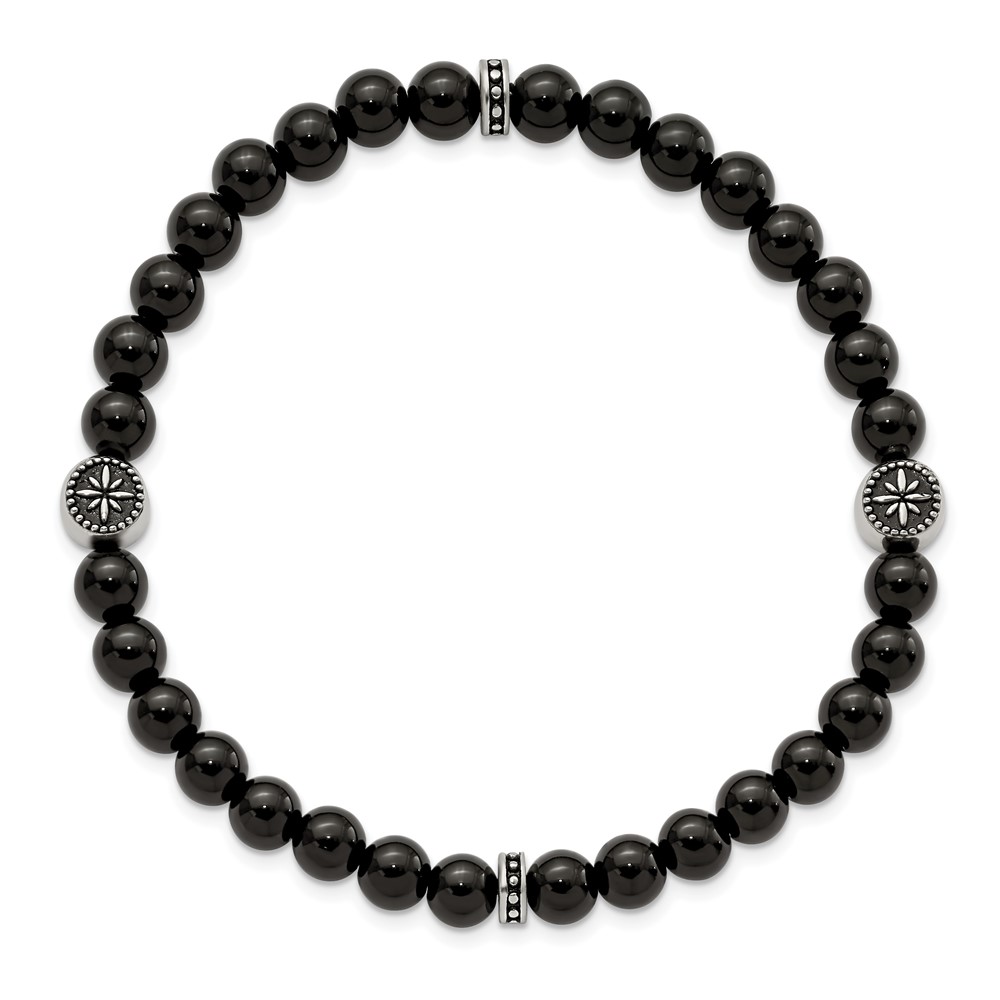 Chisel Stainless Steel Antiqued and Polished 6mm Black Agate Beaded Stretch Bracelet