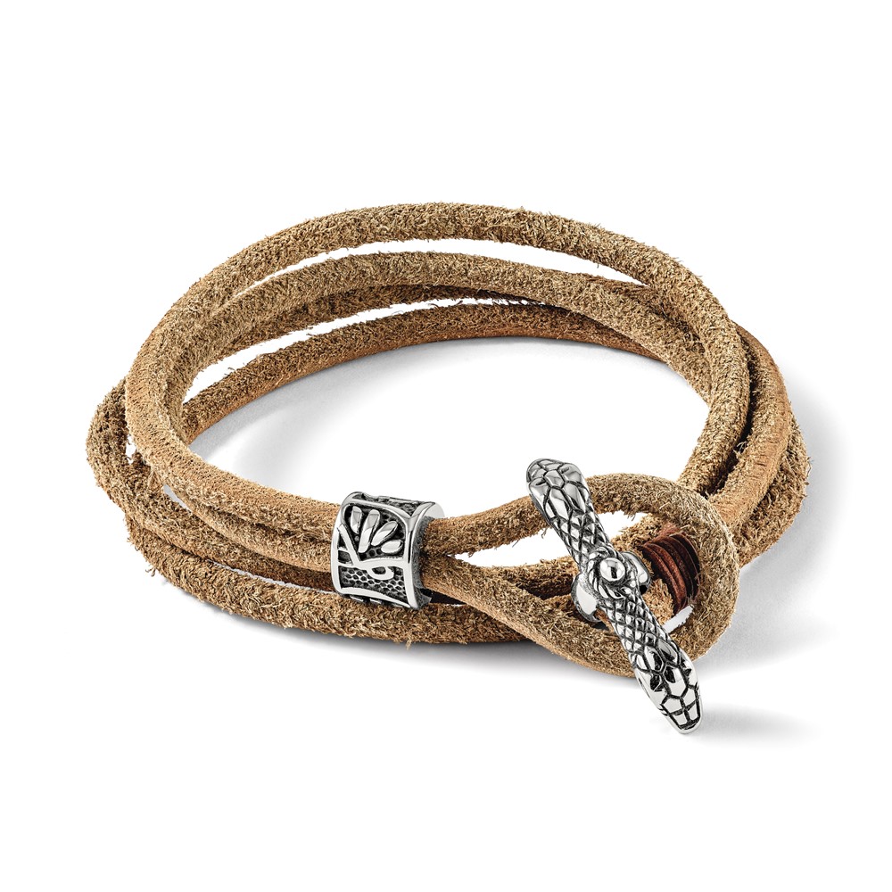 Chisel Stainless Steel Antiqued and Polished Snake Heads Tan Leather 16 inch Wrap Bracelet