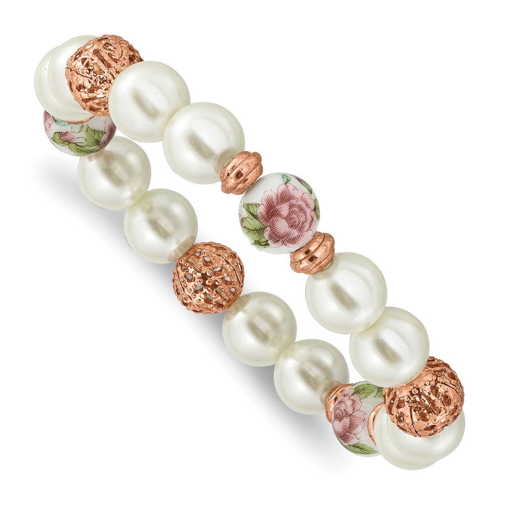 1928 Jewelry Rose-tone Filigree Pattern Imitation Pearl Floral Motif Decal Beaded Stretch Bracelet