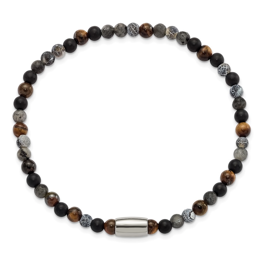 "Chisel Stainless Steel Polished 5mm Spectrolite, Agate, Tiger's Eye and Blue Stone Beaded Stretch Bracelet "