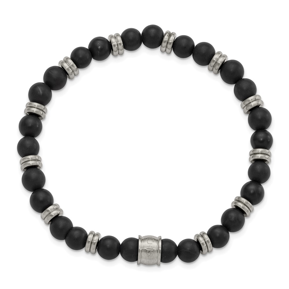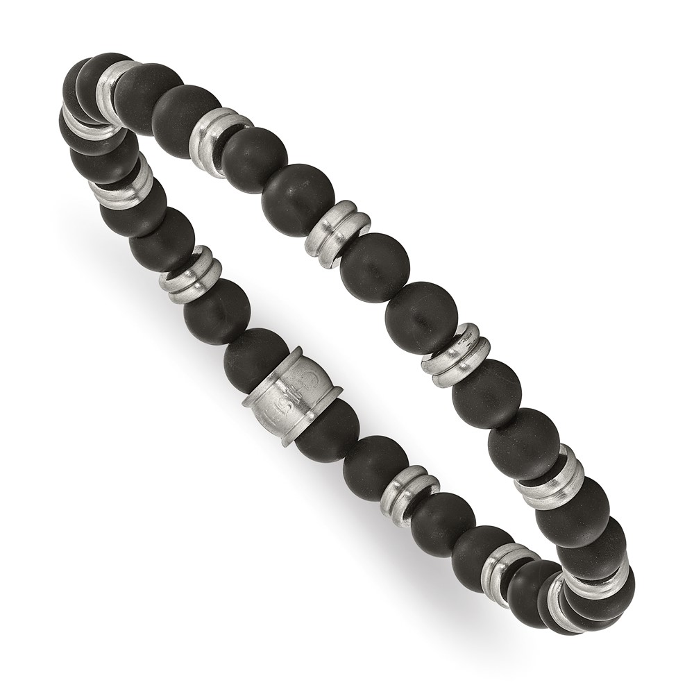 Chisel Stainless Steel Brushed 6.5mm Black Agate Beaded Stretch Bracelet