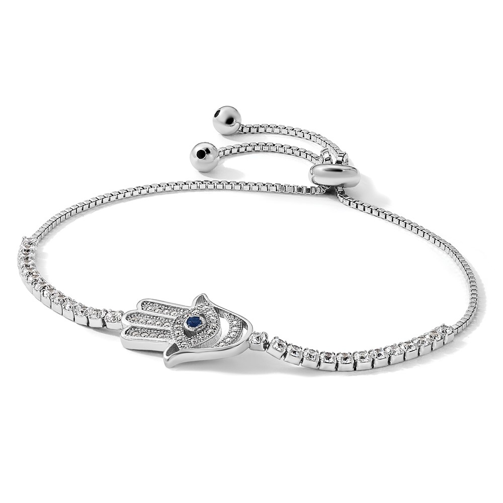 Sterling Silver Rh-plated Clear and Blue CZ Evil Eye Hamsa Adj Bracelet