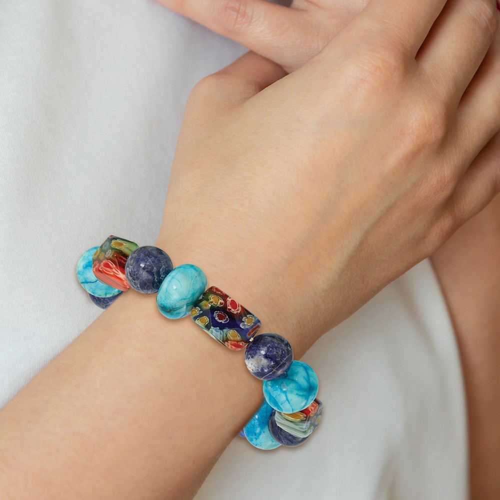 Agate, Lapis and Kangsai Glass Beaded Stretch Bracelet