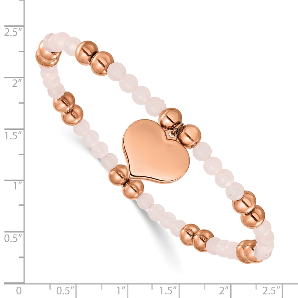 Chisel Stainless Steel Polished Rose IP-plated Heart Dangle 6mm Pink Quartz Beaded 7.75 inch Stretch Bracelet
