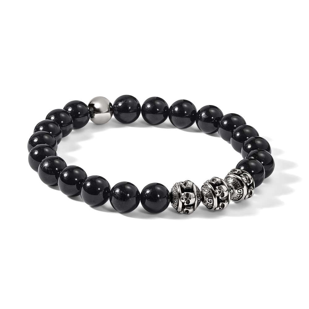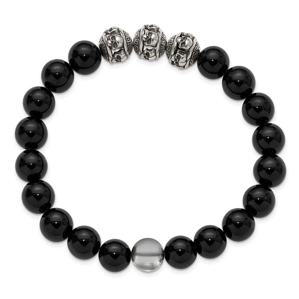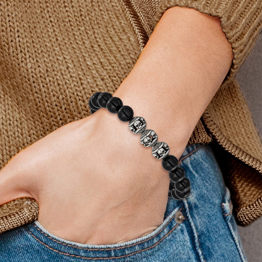 Chisel Stainless Steel Antiqued and Polished Skull Beads and Black Onyx 7.5 inch Stretch Bracelet