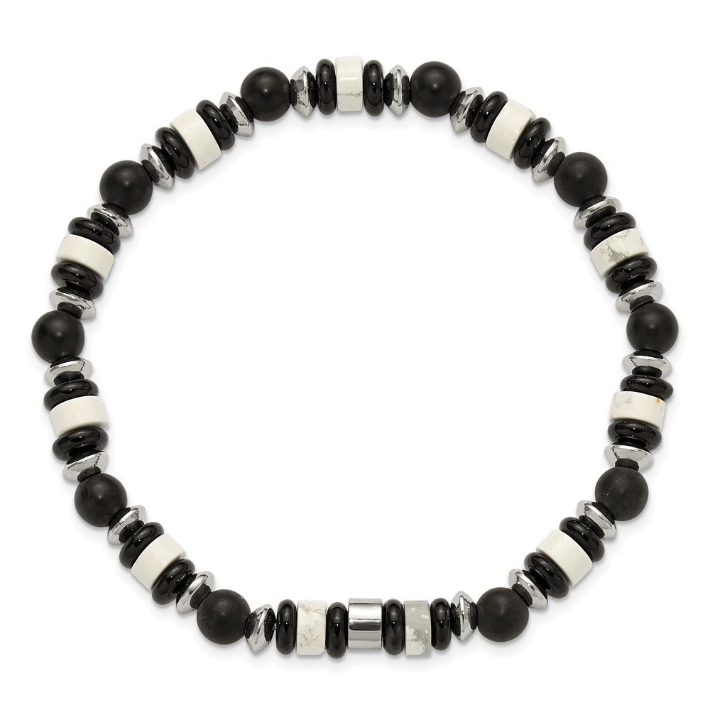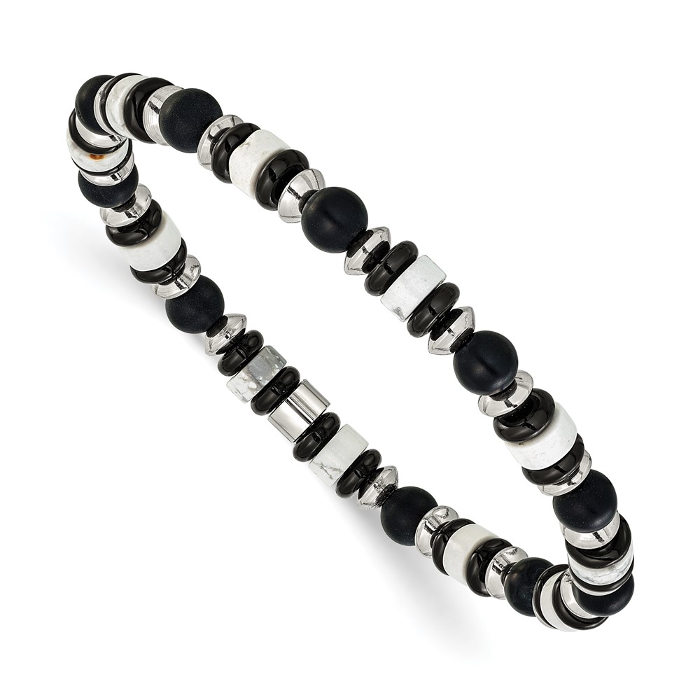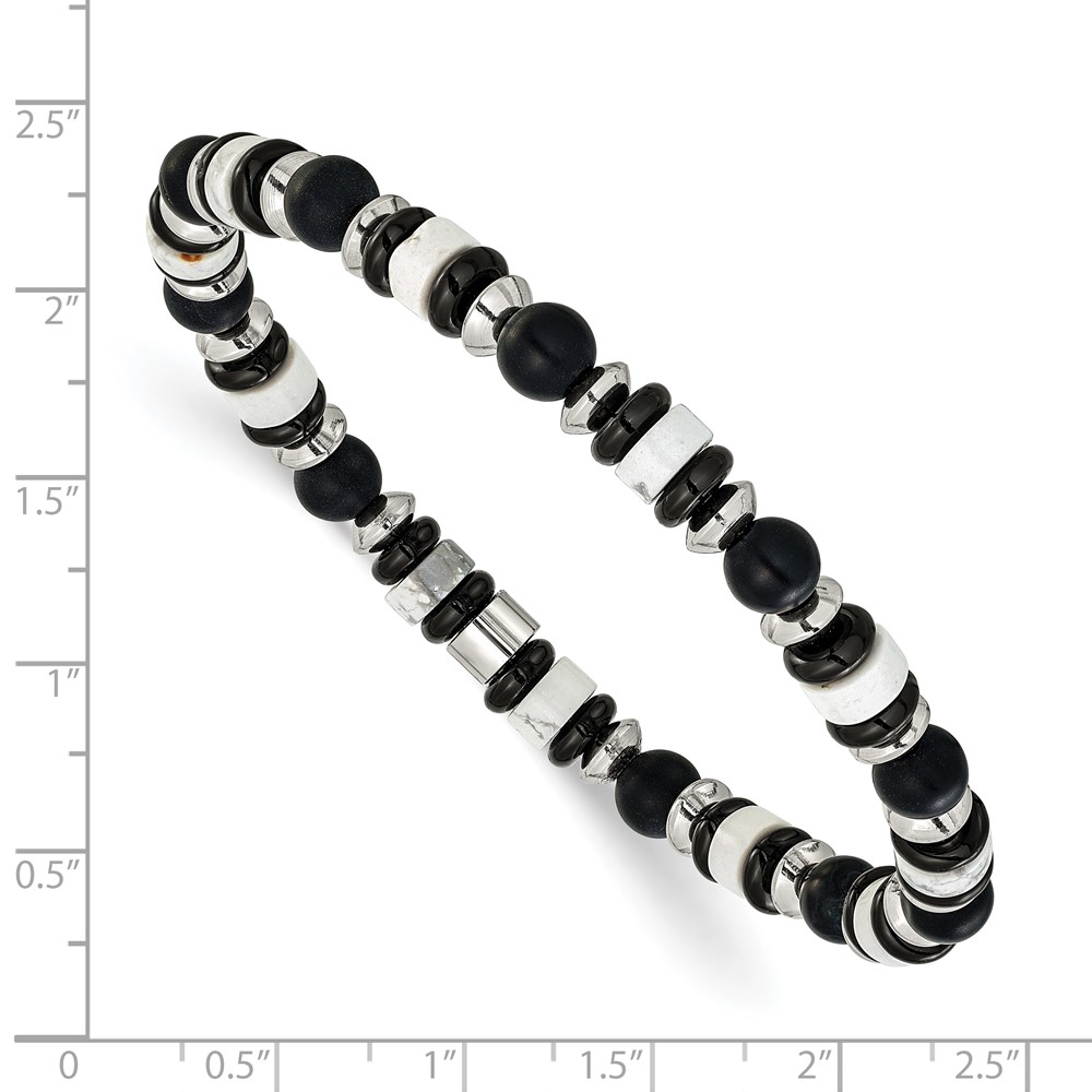 Chisel Stainless Steel Polished 6.50mm White Howlite and Black Onyx Beaded 7.5 inch Stretch Bracelet