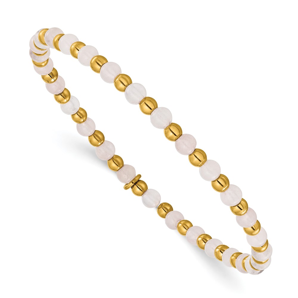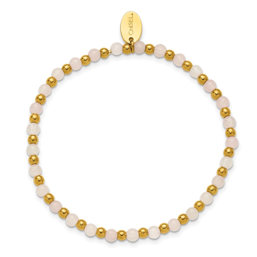 Chisel Stainless Steel Polished Yellow IP-plated 3mm Pink Quartz Beaded 6.25 inch Stretch Bracelet