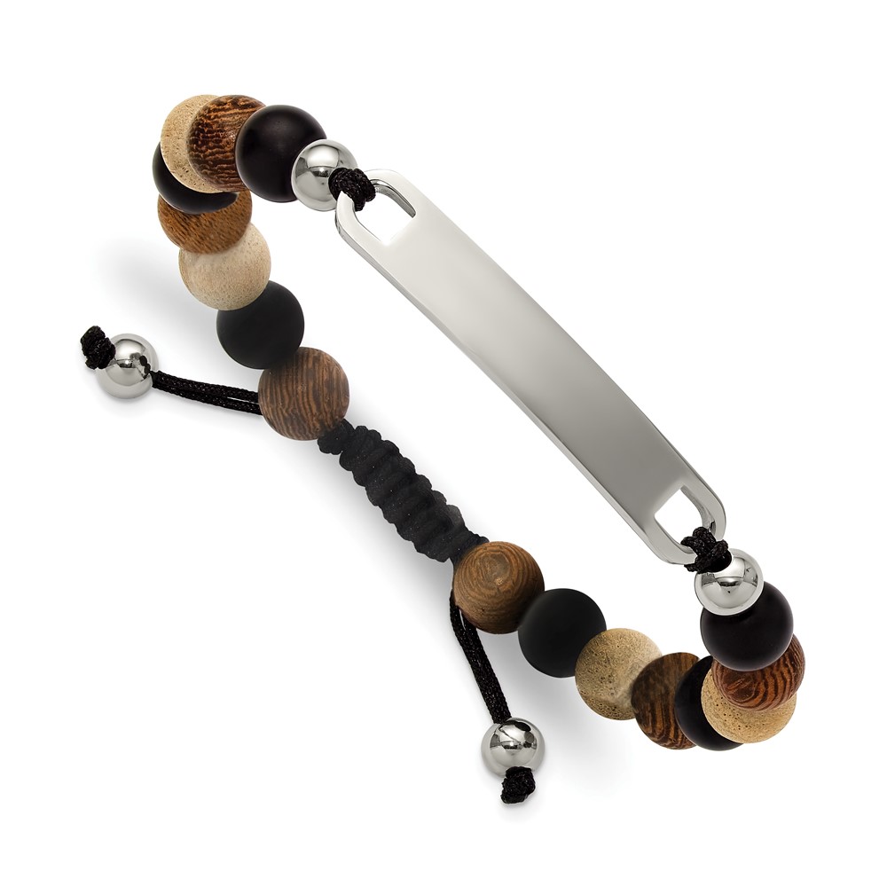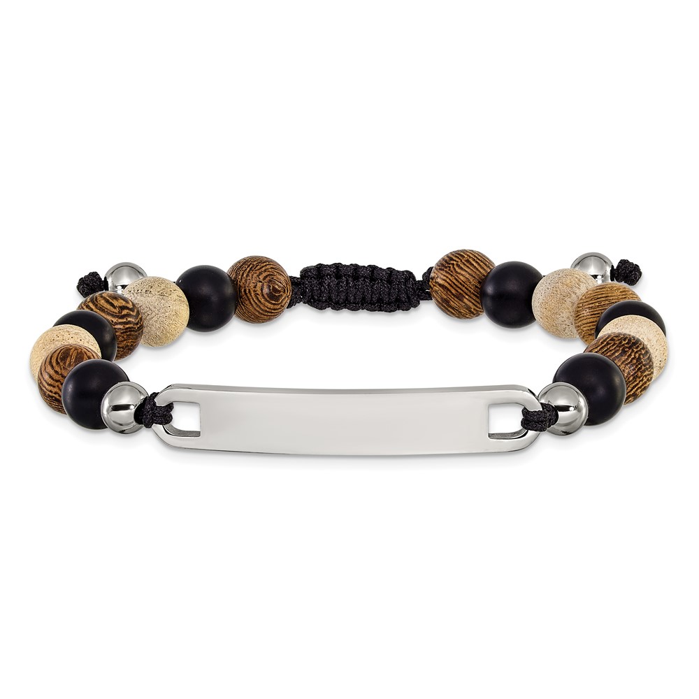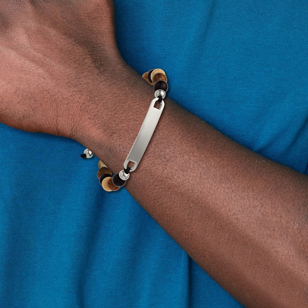 "Chisel Stainless Steel Polished Camphor, Tigerwood and Onyx Beaded Black Nylon 6.75 inch to 8.5 inch Adjustable ID Bracelet"