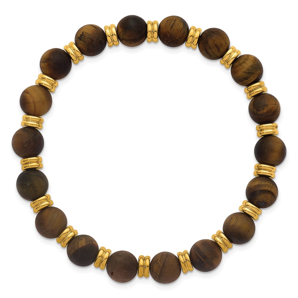 Stainless Steel Polished Yellow IP 8.5mm Tigers Eye Beaded Stretch Bracelet