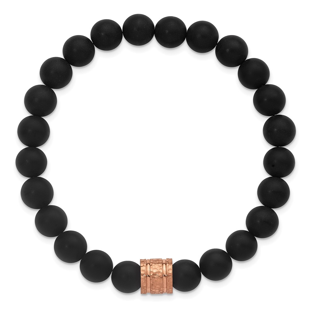 StainlessSteel Polished Hammered Rose IP 8.5mm Onyx Beaded Stretch Bracelet