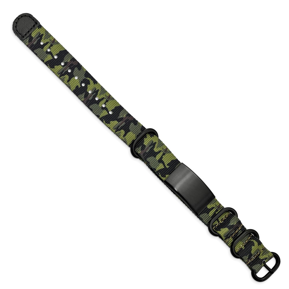 Stainless Steel Brushed Blk IP Green Camo Fabric Adjustable ID Bracelet