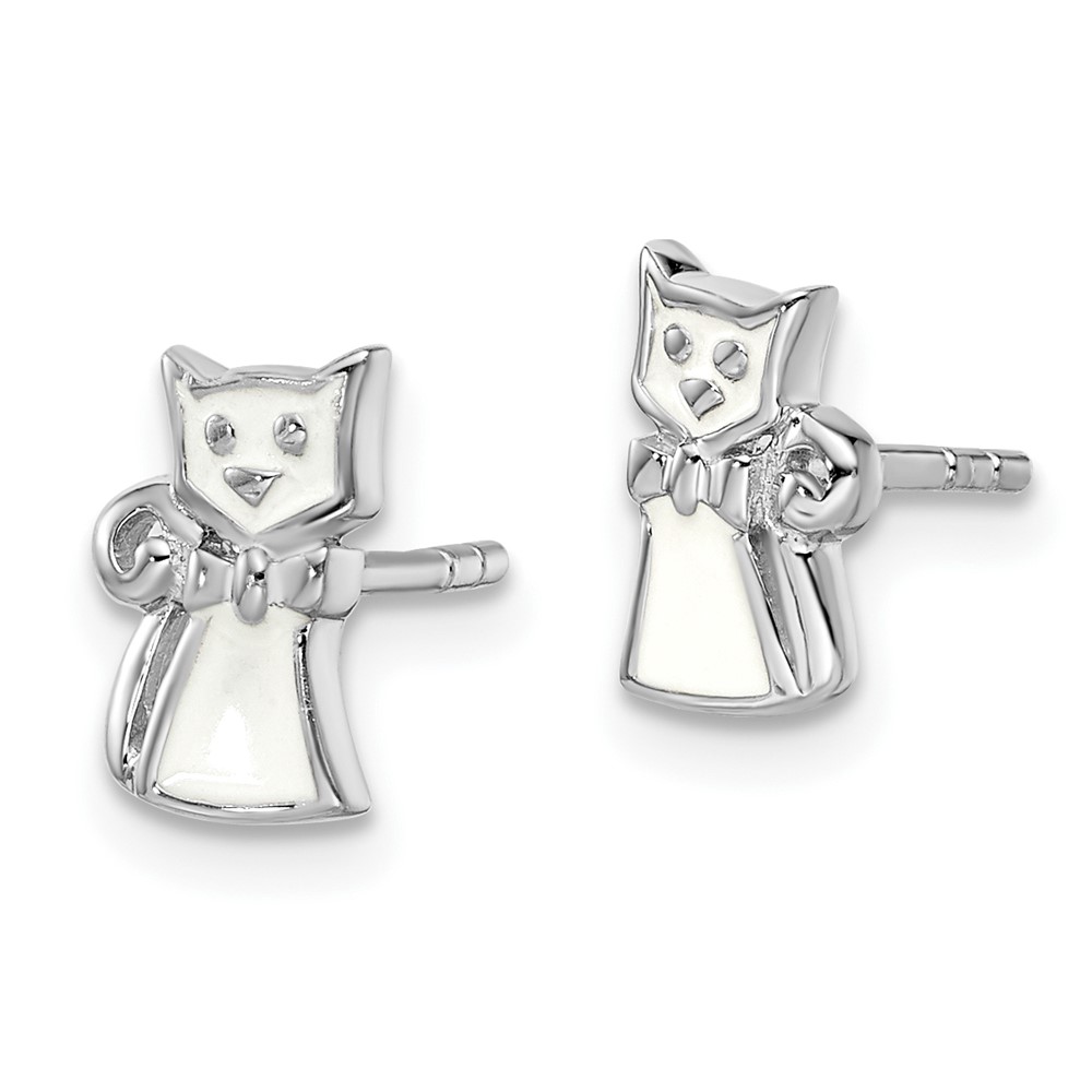 Sterling Silver Rhodium-plated Polished White Enameled Cat Children's Post Earrings