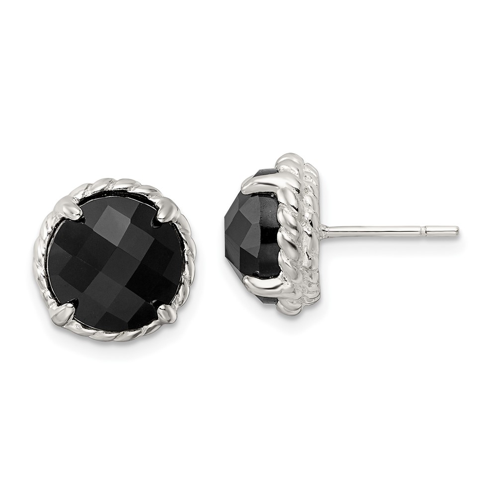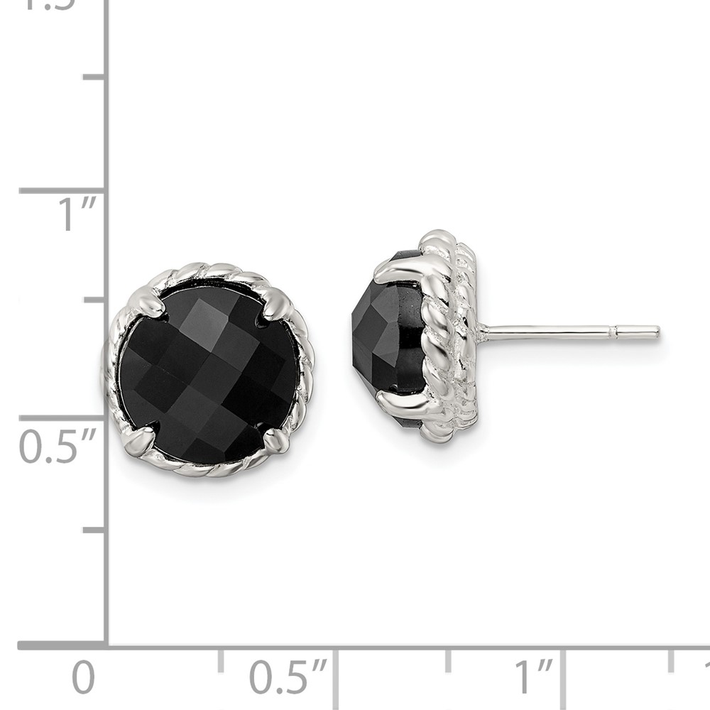 Sterling Silver Polished & Twisted Edge Round Onyx Post Earrings