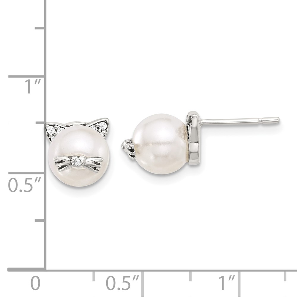 Sterling Silver Polished and Antiqued CZ and Syn. Pearl Cat Post Earrings