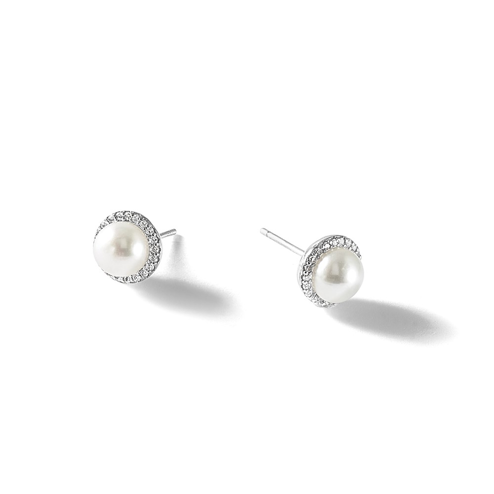 Cheryl M Sterling Silver Rhodium-plated Polished Freshwater Cultured Pearl and CZ Halo Post Earrings