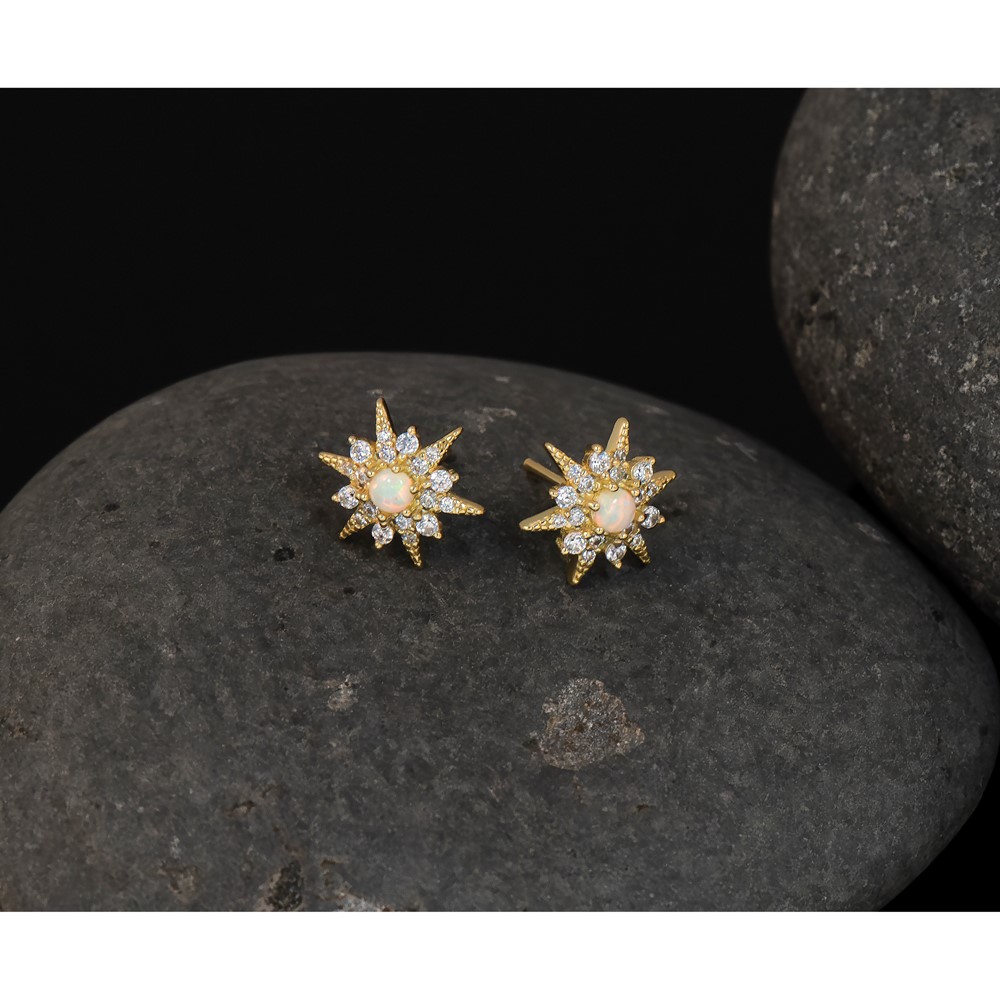 Sterling Silver Gold-Tone Polished Lab Created Opal and CZ Starburst Post Earrings