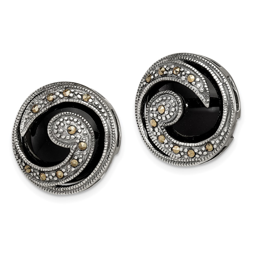 Sterling Silver Antiqued Onyx & Marcasite Round Wave Post Earrings