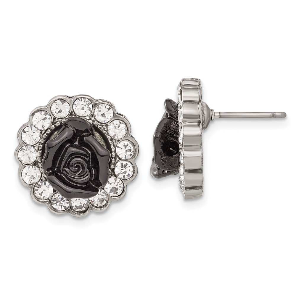1928 Silver-tone Black Enamel Flowers & Crystal Post Earrings