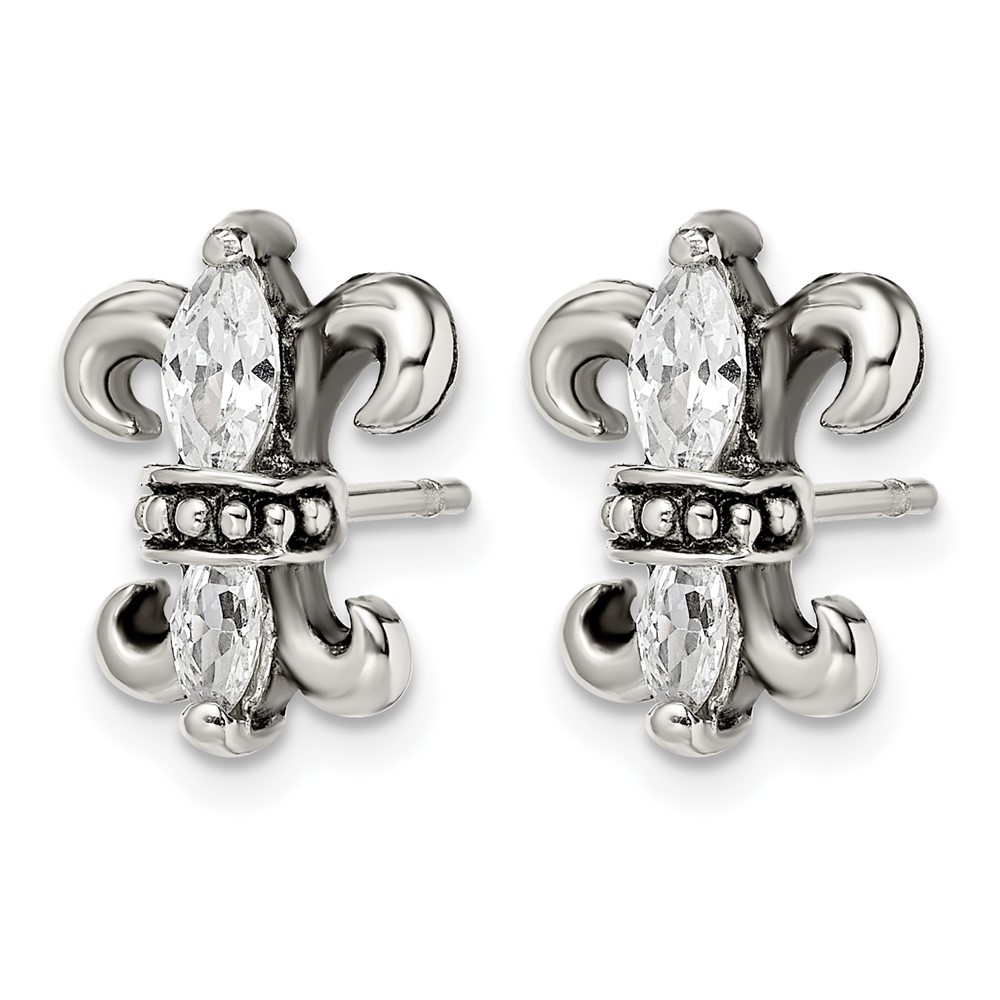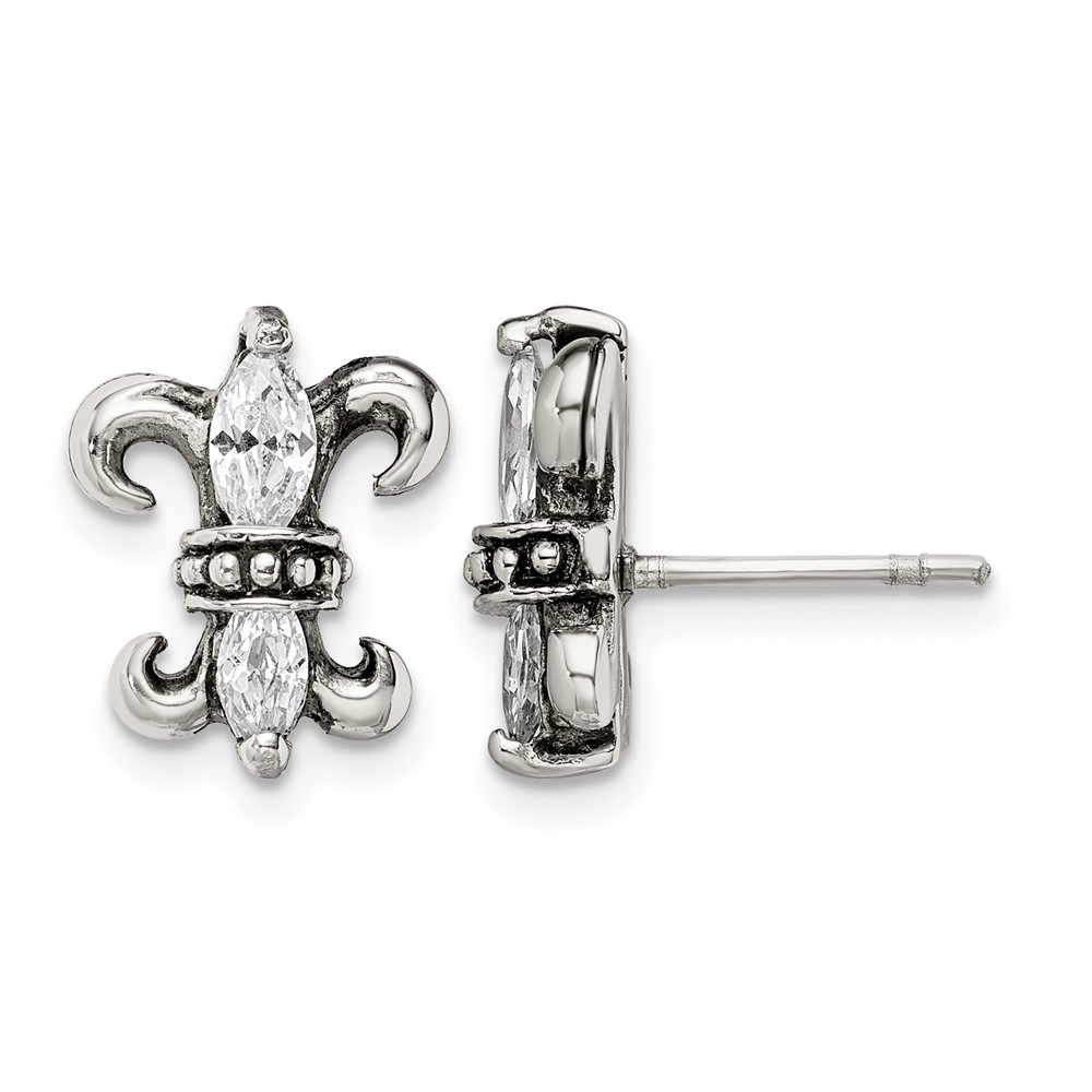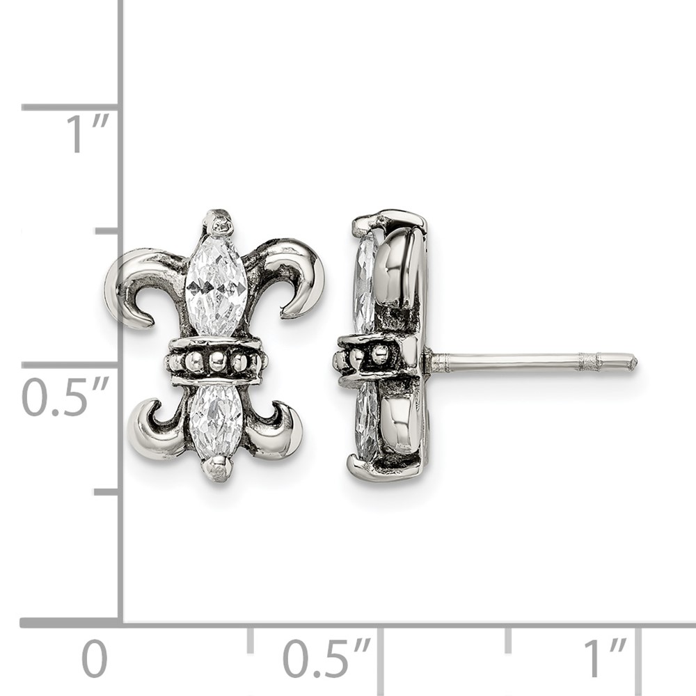 Stainless Steel Antiqued Polished & Textured w/CZ Fleur de lis Post Earring