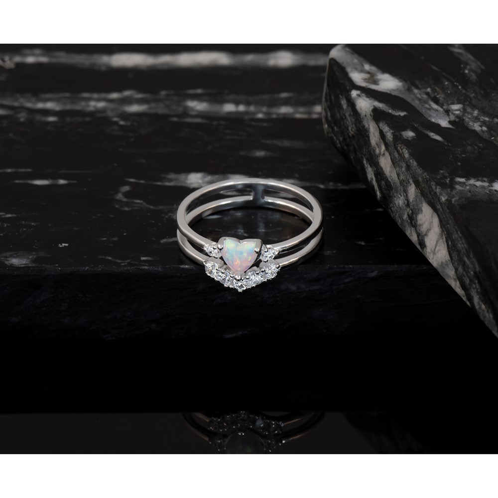 Sterling Silver CZ & Heart Created White Opal Double Band Ring