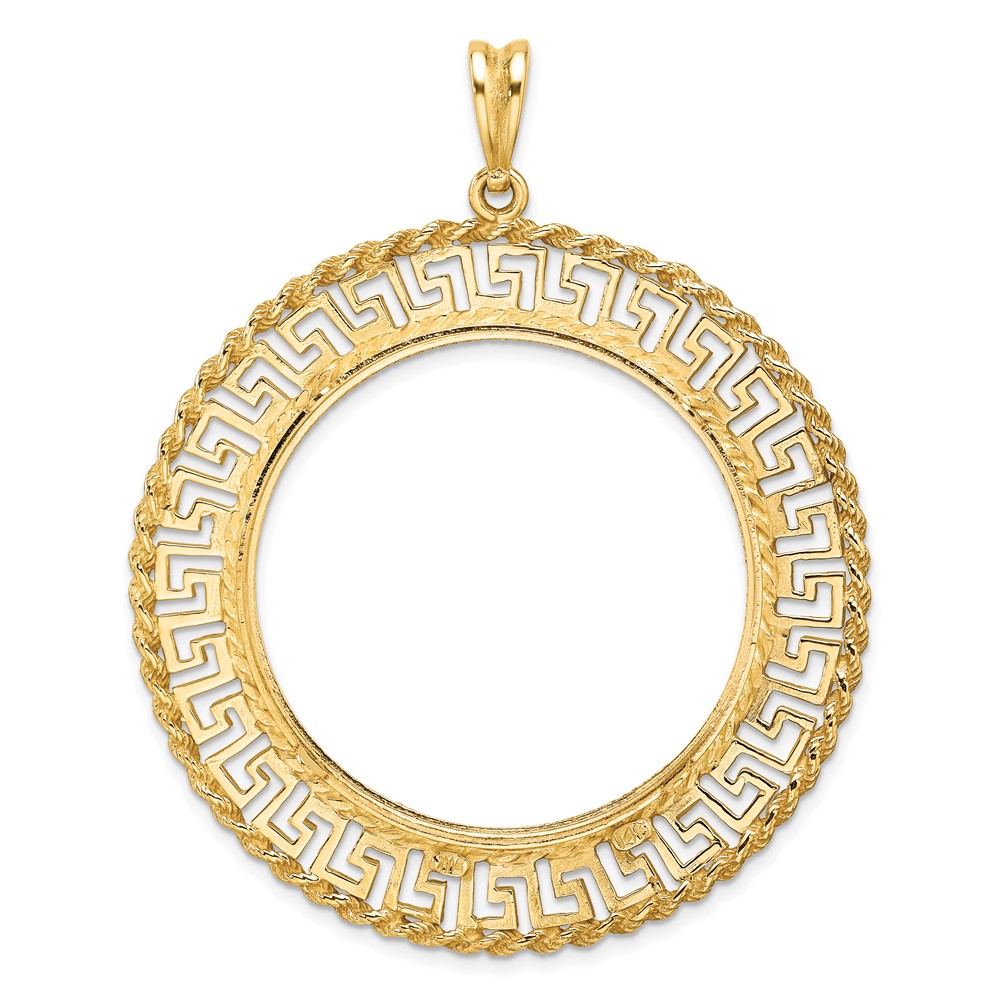 Wideband Distinguished Coin Jewelry 14k Polished and Diamond-cut Greek Key with Rope Border 34.2mm Prong Coin Bezel Pendant