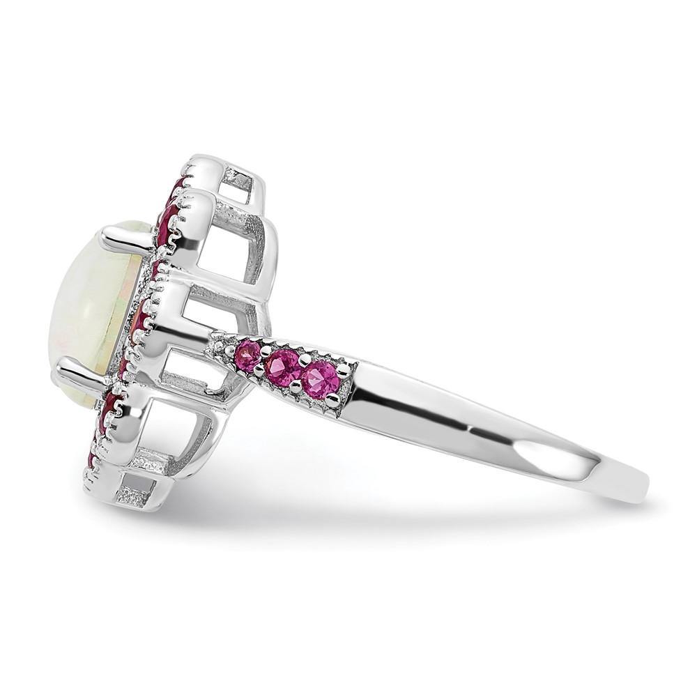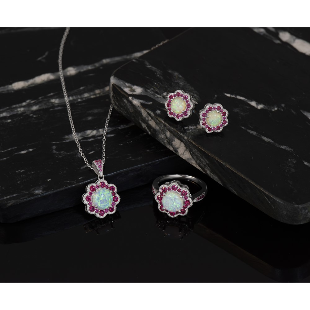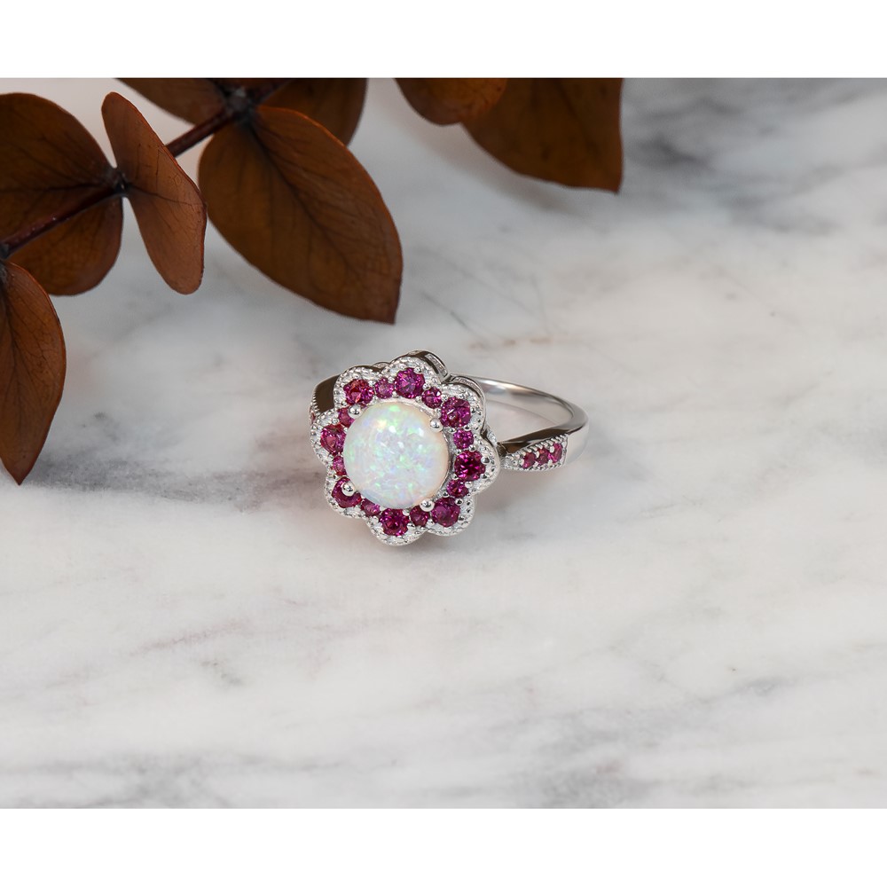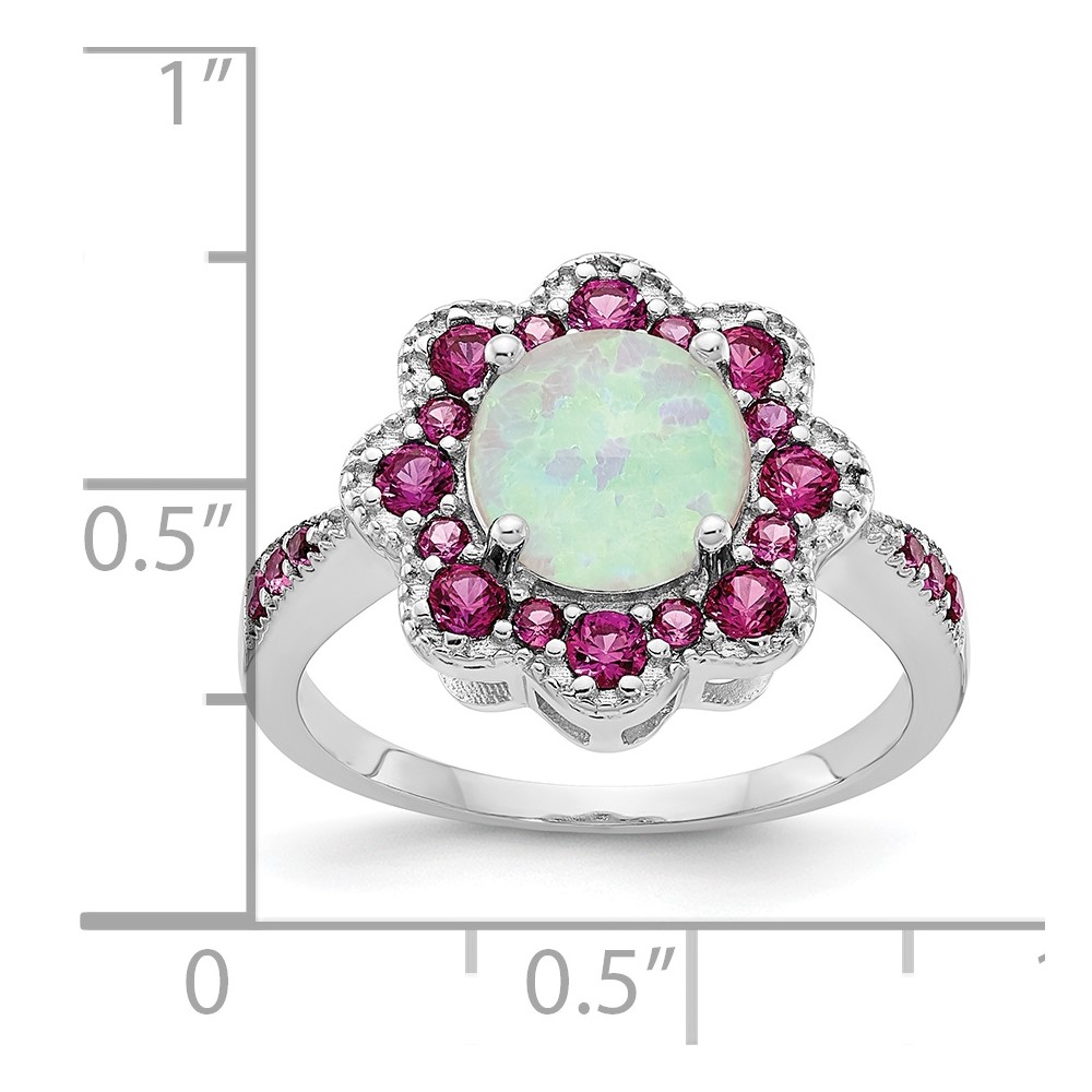 Cheryl M Sterling Silver Rhodium-plated Cabochon Lab Created Opal and Brilliant-cut Red Nano Crystal Flower Ring