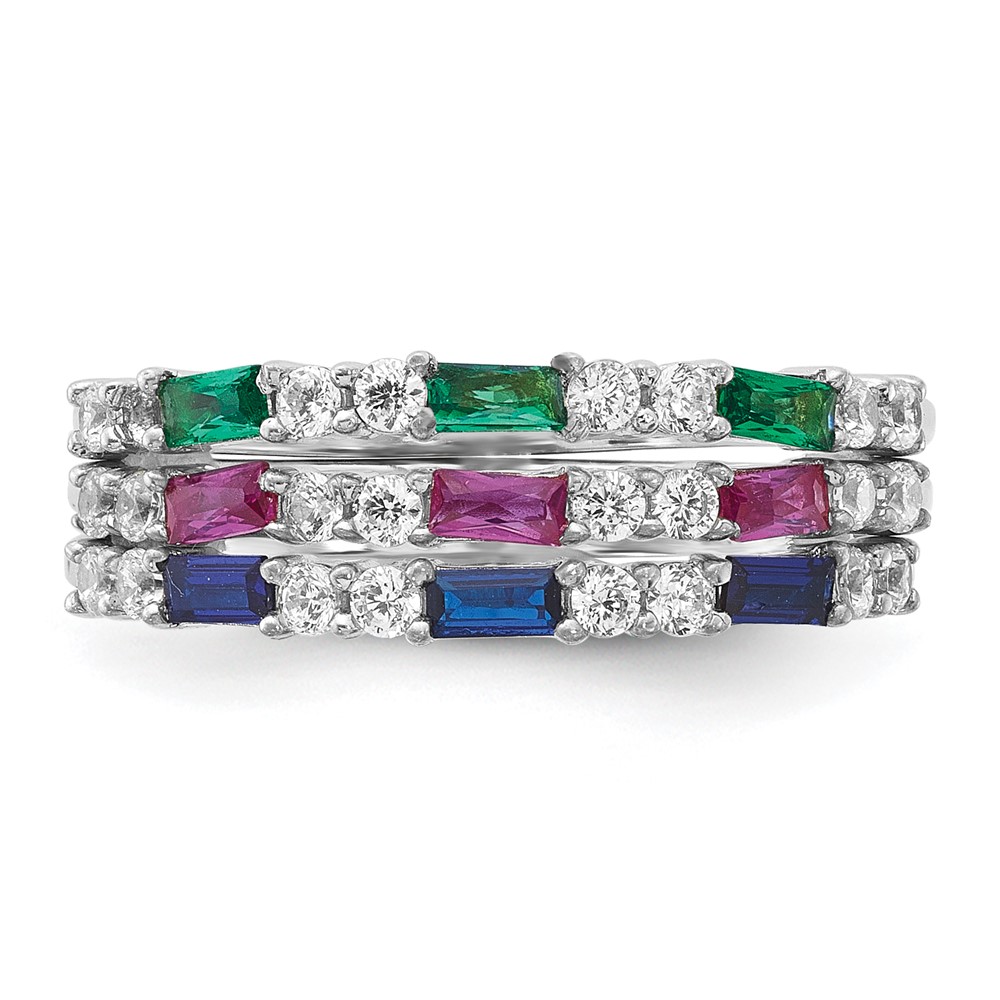 Sterling Silver Rhodium-plated Green, Red and Blue CZ 3 Ring Set