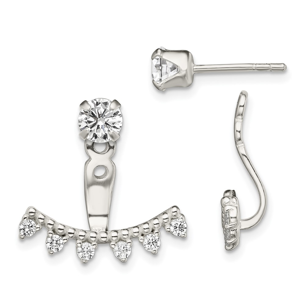 Sterling Silver Polished Beaded Curve & CZ Front & Back Post Earrings