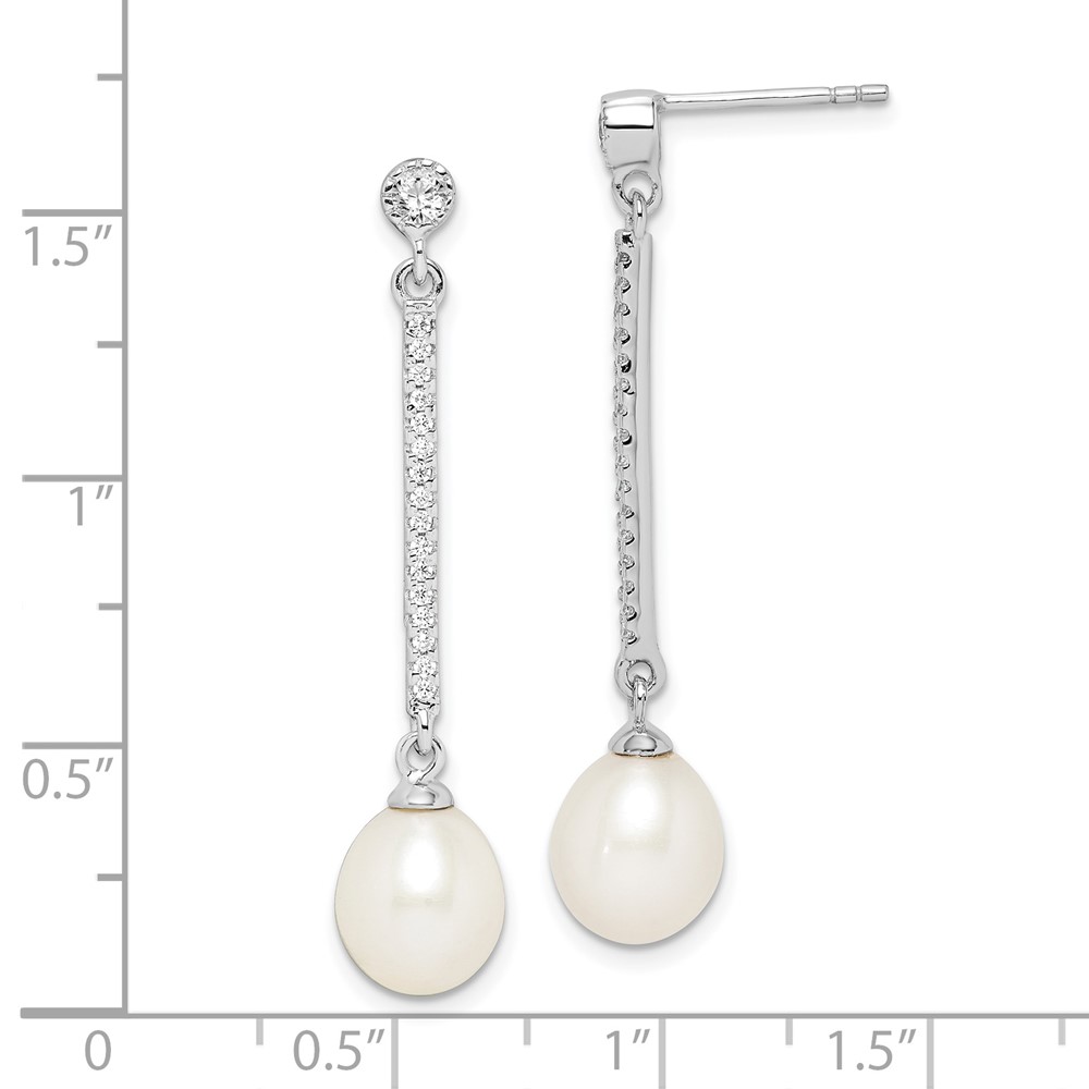 Sterling Silver Rhodium-plated 8-9mm White Rice Freshwater Cultured Pearl and CZ Post Dangle Earrings