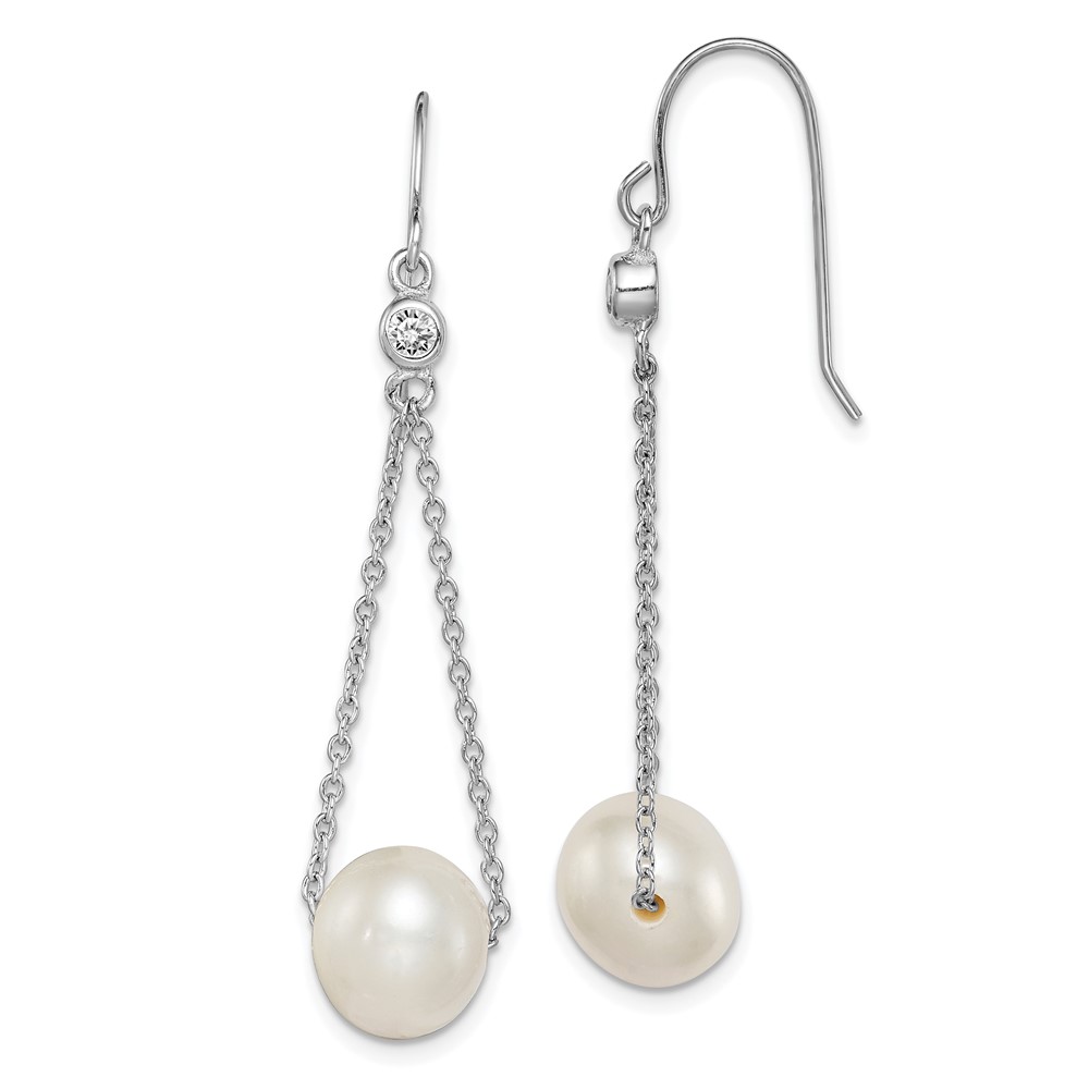 Sterling Silver Rhodium-plated 9-10mm White Semi-Round Freshwater Cultured Pearl and CZ Dangle Earrings