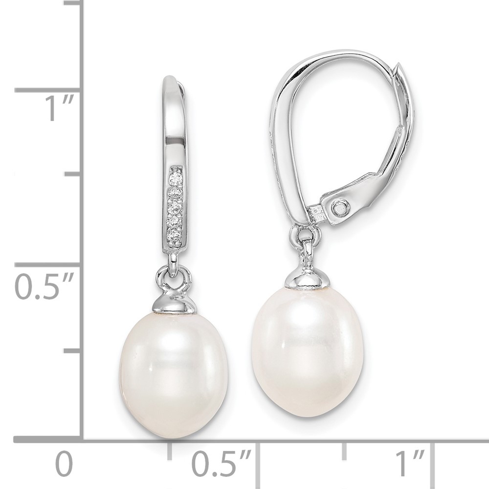 Sterling Silver Rhodium-plated 7-8mm White Teardrop Freshwater Cultured Pearl and CZ Leverback Dangle Earrings