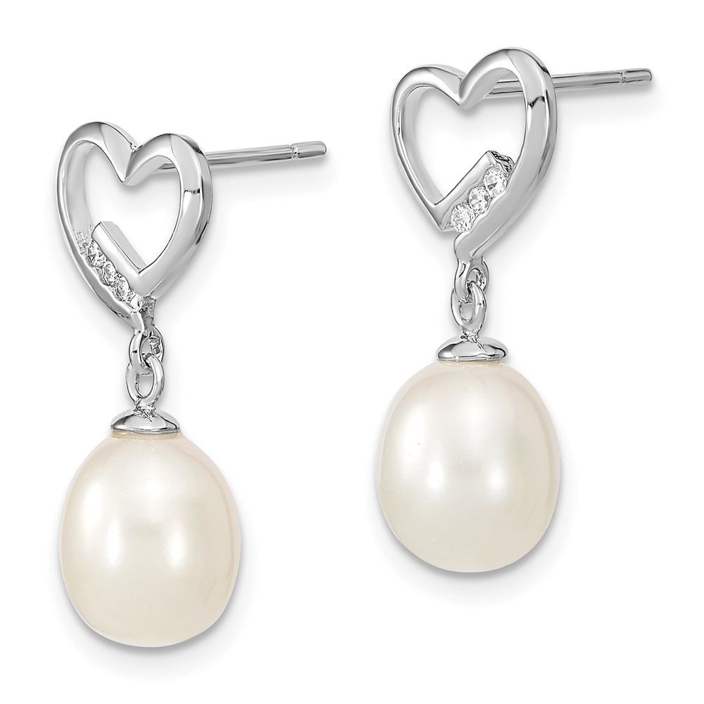 Sterling Silver Rhodium-plated 7-8mm White Rice Freshwater Pearl and CZ Heart Post Dangle Earrings