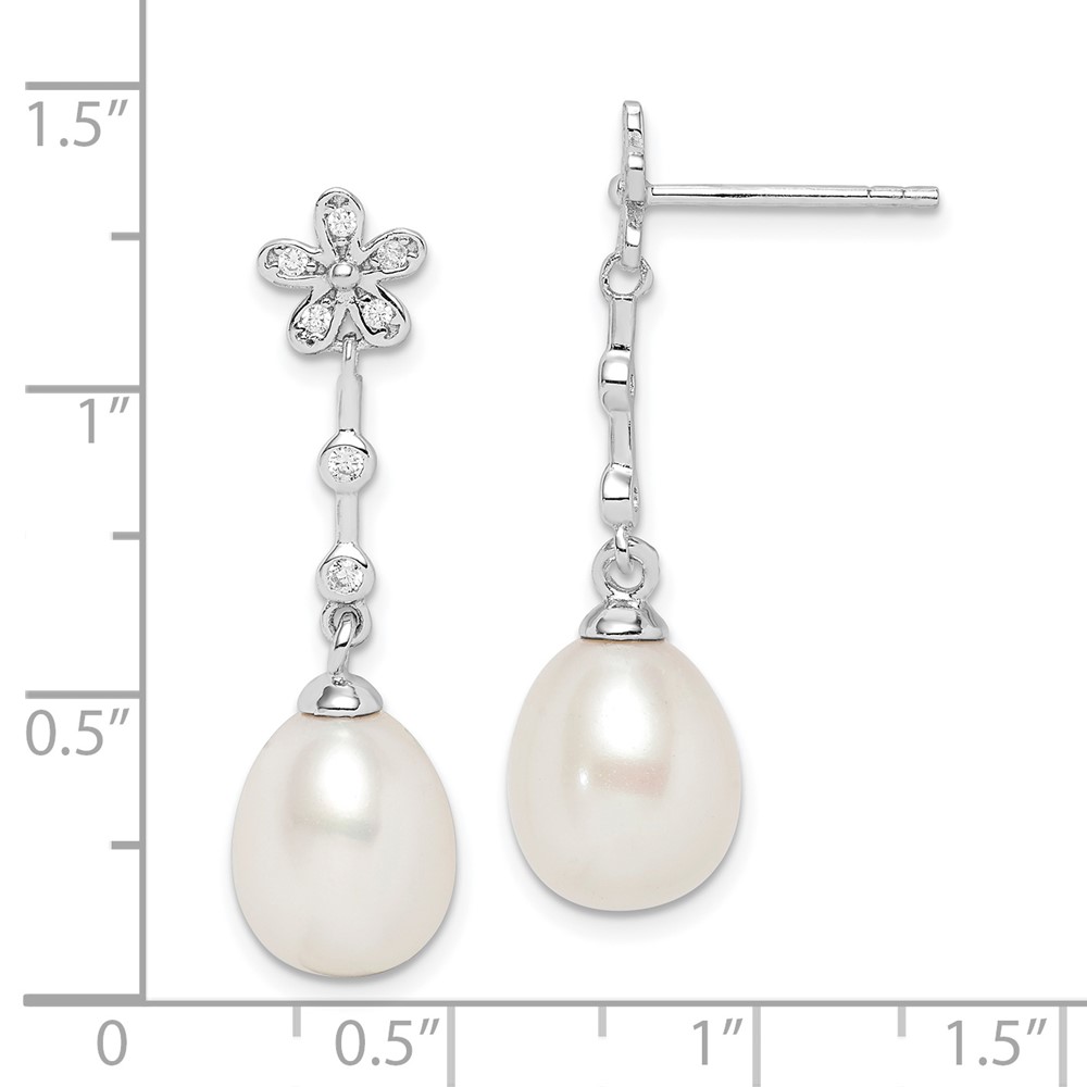 Sterling Silver Rhodium-plated 8-9mm White Rice Freshwater Cultured Pearl and CZ Flower Post Dangle Earrings