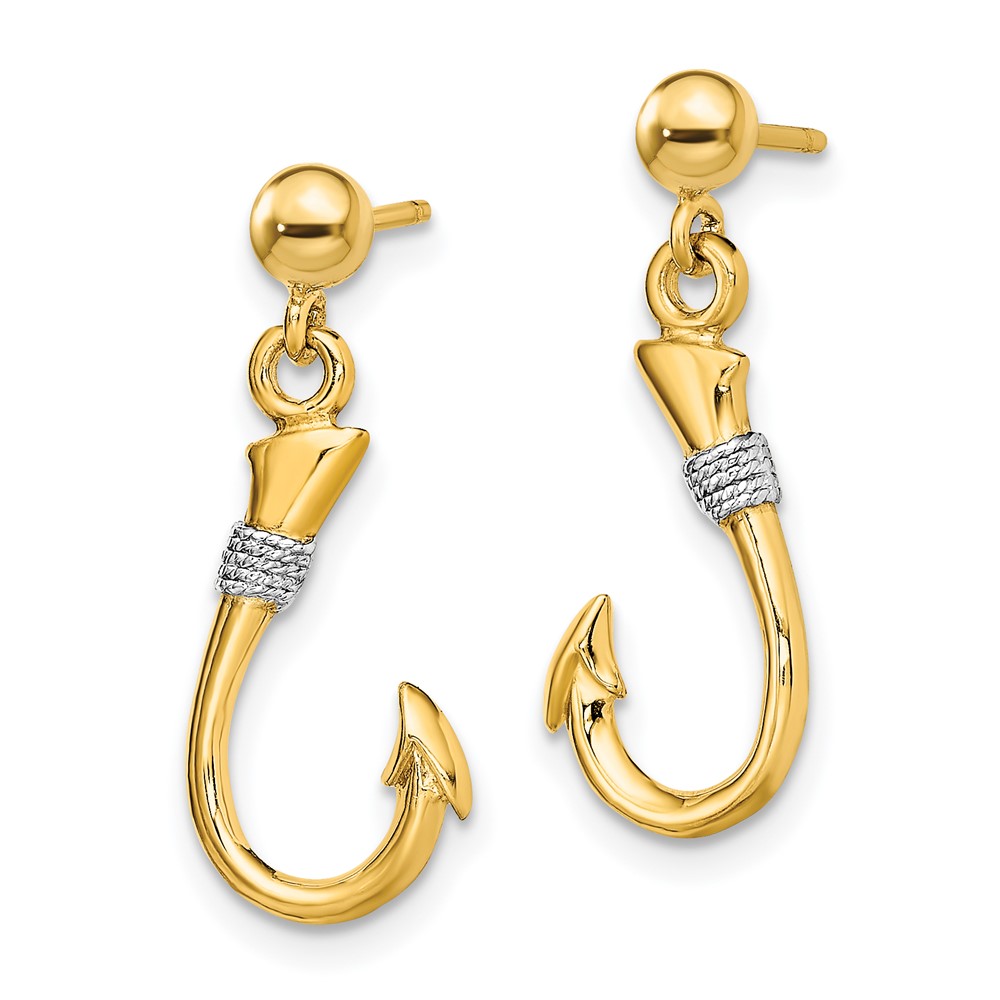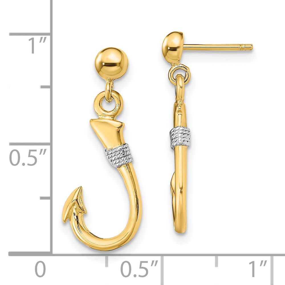 14K and White Rhodium 3-D Fish Hook with Rope Dangle Post Earrings