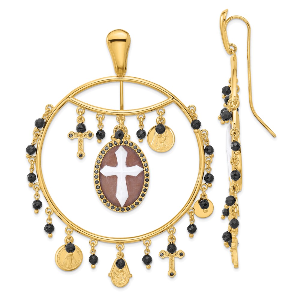 Sterling Silver 18k Gold-plated Polished Textured and Beaded Black CZ Religious Cameo Threader Earrings