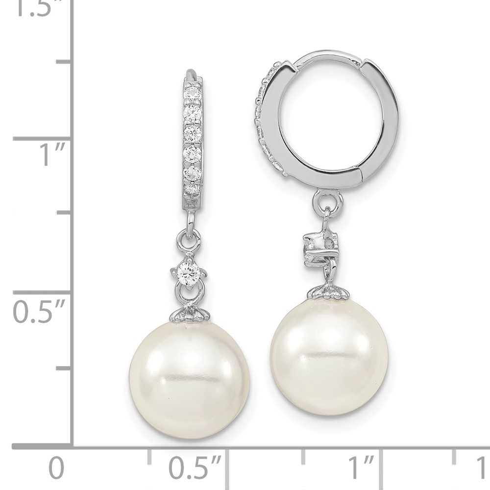 Majestic Sterling Silver Rhodium-plated 10-11mm White Imitation Shell Pearl CZ Hinged Hoop Dangle Earrings