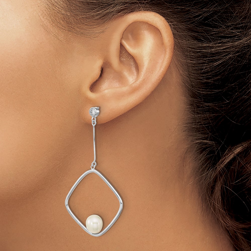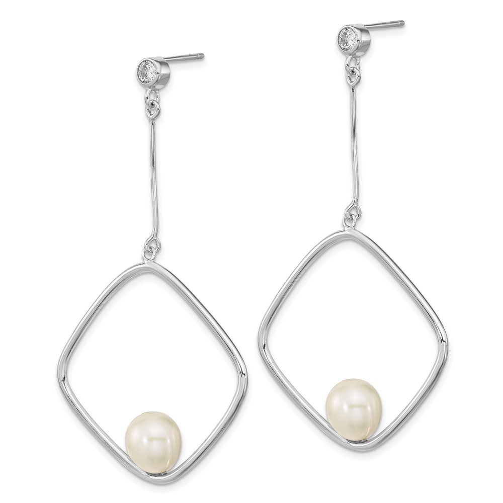 Sterling Silver Rhod-plated 7-8mm White Rice FWC Pearl CZ Dangle Earrings