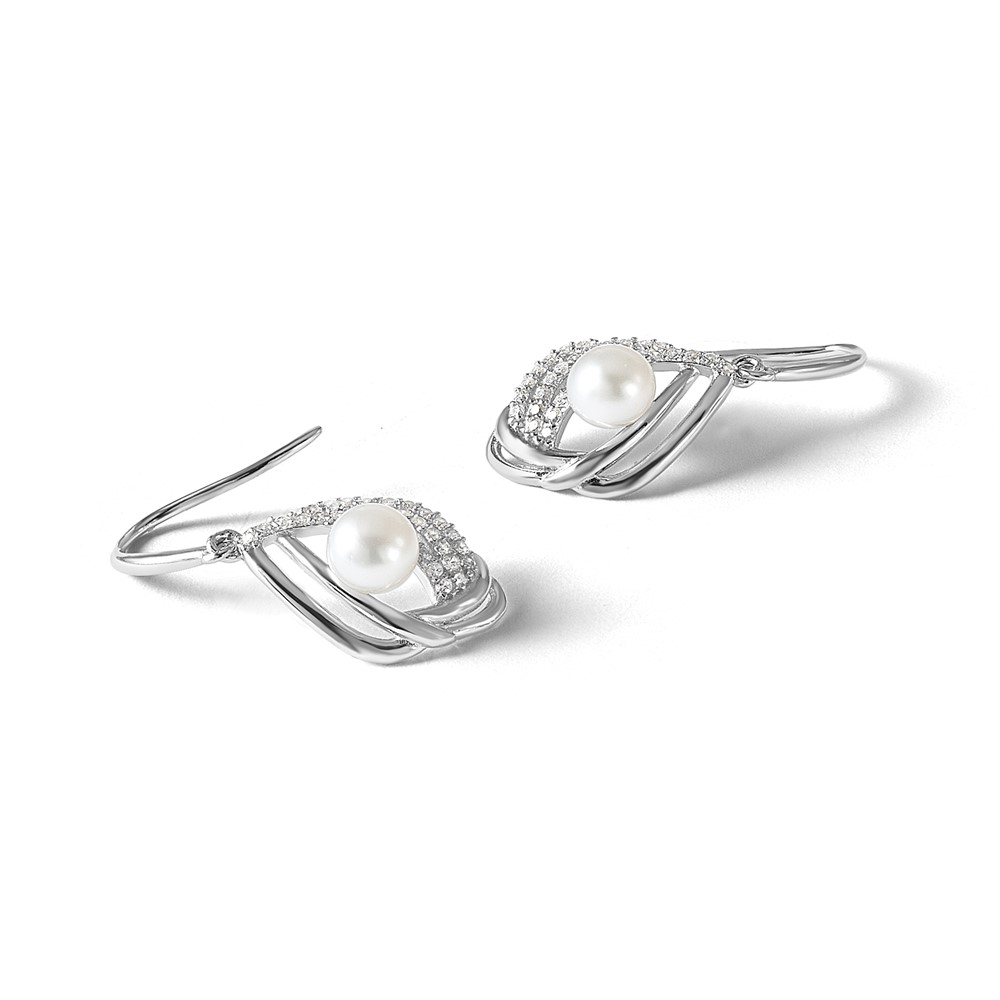 Cheryl M Sterling Silver Rhodium-plated Freshwater Cultured Pearl and Brilliant-cut CZ Teardrop Shepherd Hook Dangle Earrings