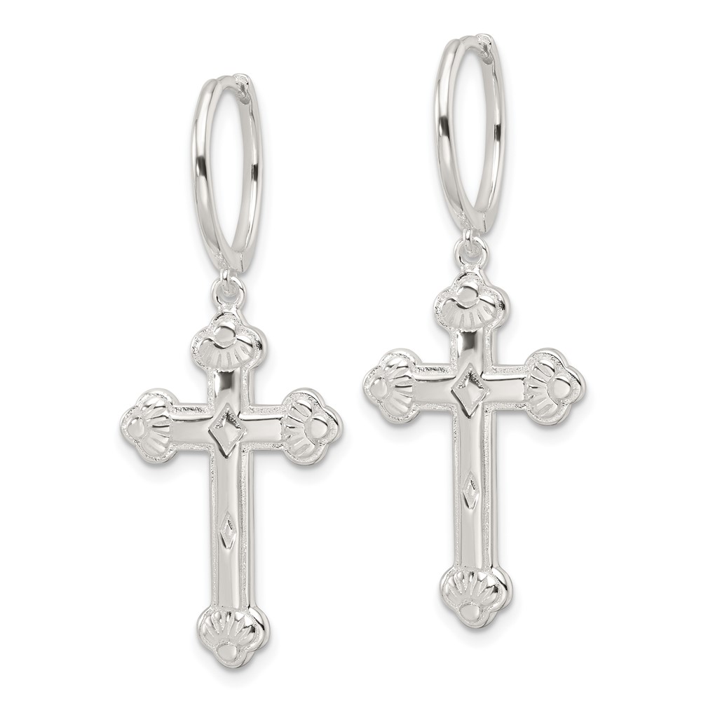 Sterling Silver E-Coating Polished Dangle Cross Round Hoop Earrings