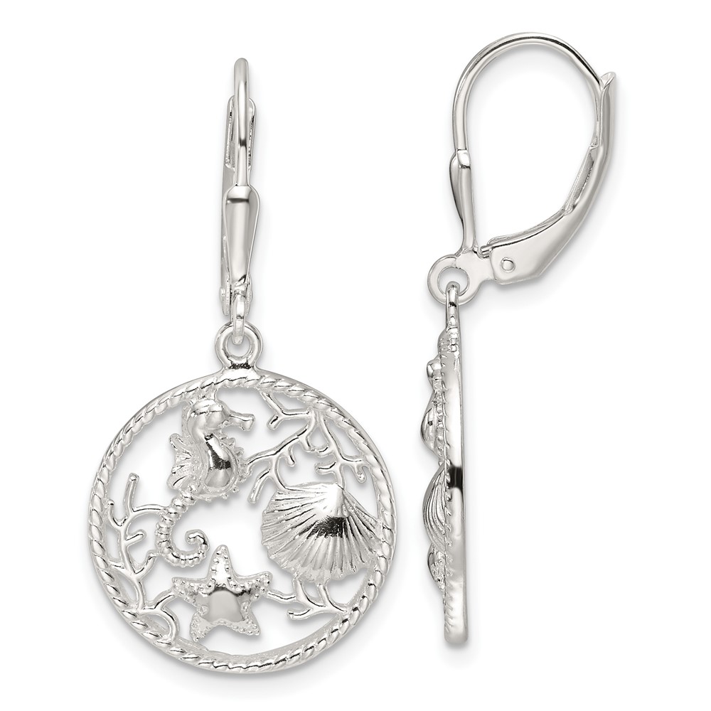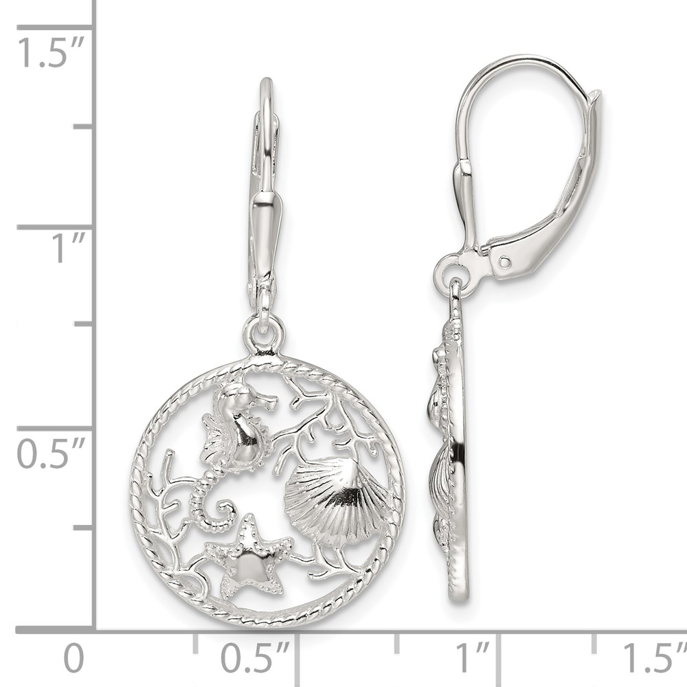 Sterling Silver Polished Sea Life Circle Dangle Leverback Earrings