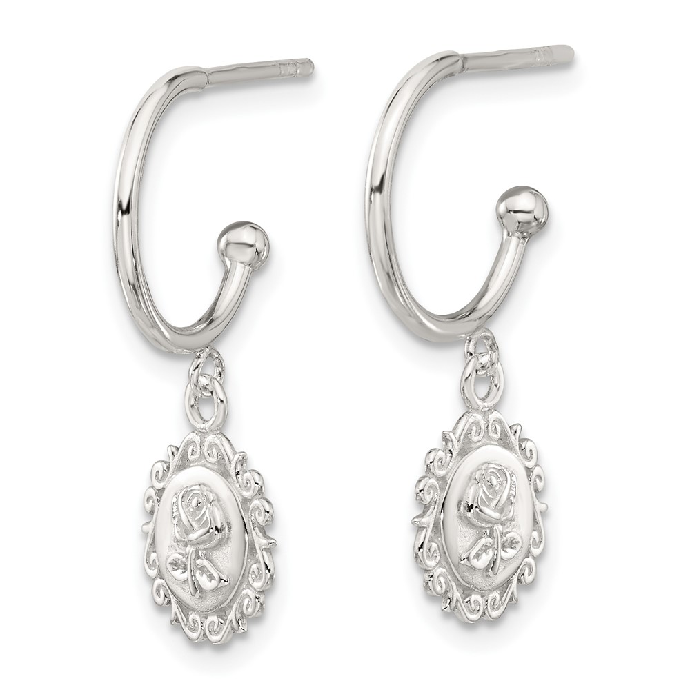Sterling Silver E-coated Rose Dangle Post Hoop Earrings