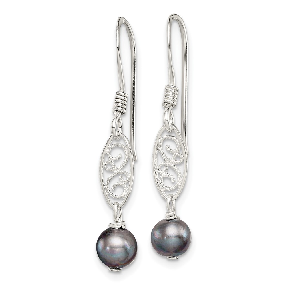 Sterling Silver Polished Filigree 5-6mm Grey Freshwater Cultured Pearl Dangle Earrings