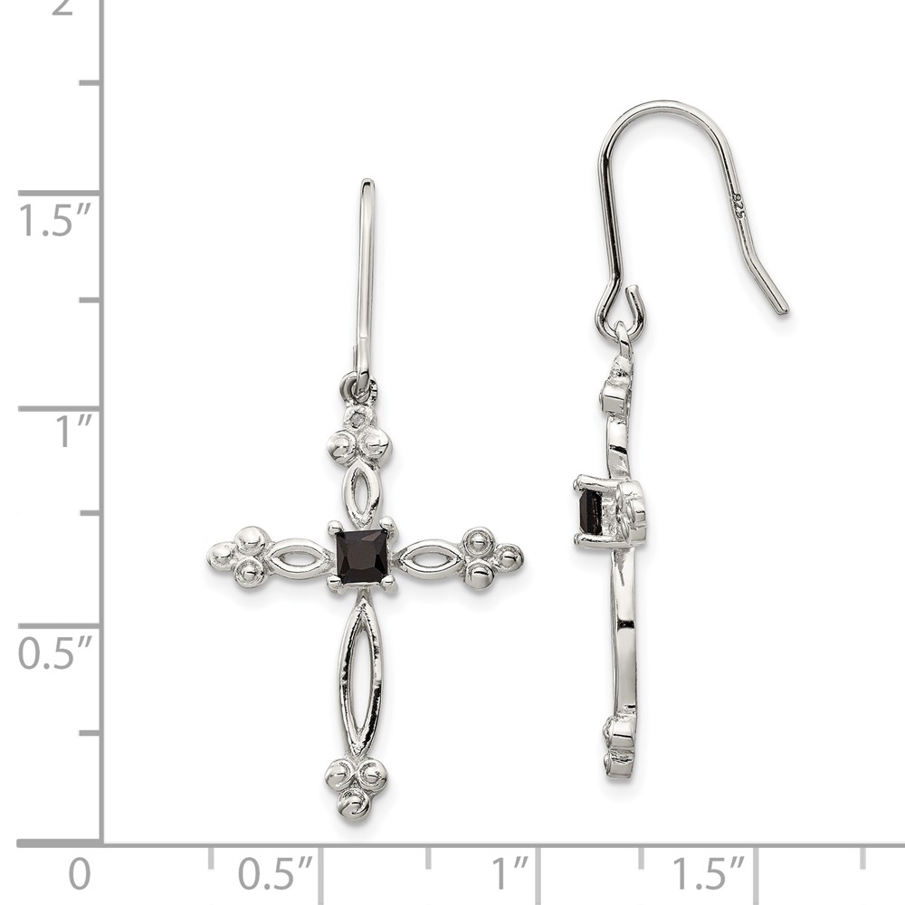 Sterling Silver Rhodium-plated Polished Diamond Accent & Black CZ Budded Cross Dangle Earrings