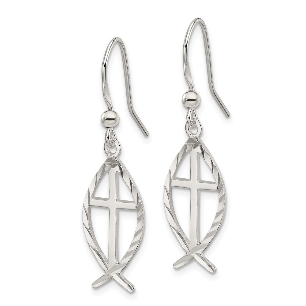 Sterling Silver Polished & D/C Cross & Ichthus Dangle Earrings